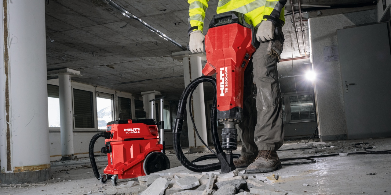 Our Dust Removal Systems (DRS) remove dust at the source and collect it with powerful vacuum cleaners like the VC 20-/40-X. In 2022, we upgraded our DRS portfolio with the TE 4-22 and TE 6-22 cordless rotary hammers. We also introduced the cordless VC10-22 battery-powered vacuum cleaner, enabling our DRS and SAFEset solutions to be fully cordless. Our portfolio for jobsite and worker safety includes air cleaners like the AIC 1000 and 2000, which filter very fine dust particles.